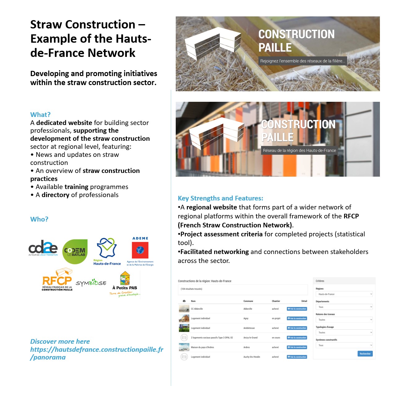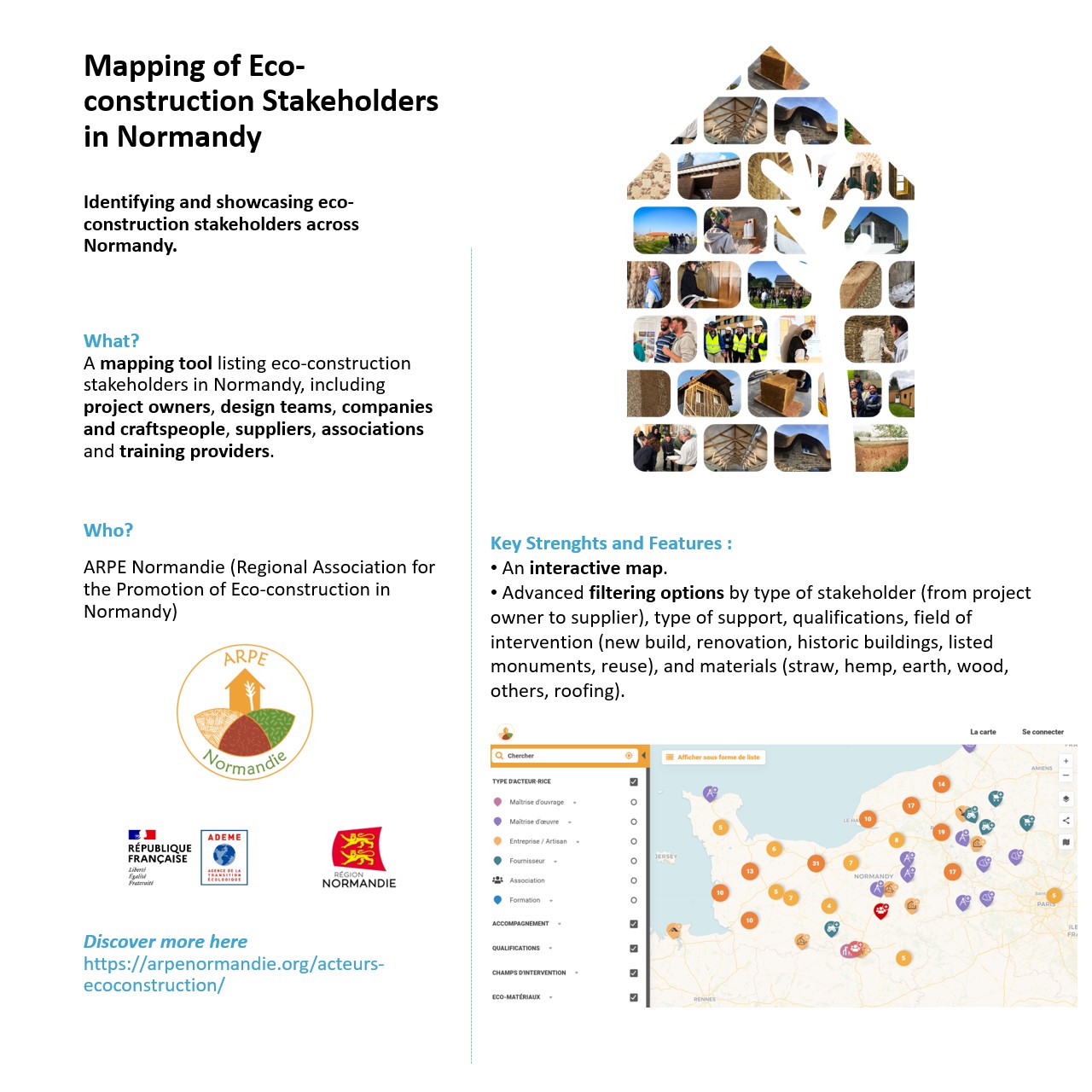 We continue our overview of initiatives that help better connect upstream and downstream actors in bio-based value chains for renovation. We are highlighting (non-exhaustively!) bio-based material mapping tools that make visible the available resources, exemplary buildings, and the stakeholders and skills present across different territories.